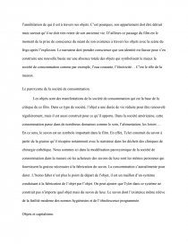 Ce film est surtout une critique de la société de consommation construite par un ensemble d’éléments depuis la construction identitaire par les objets ou la domination des objets culturels américains ou encore le savon de luxe. Chaque élément permet de confronter le spectateur à une réflexion sur sa propre condition de consommateur. Ce film est devenu culte par les multiples aspects qu’il contient au delà des objets puisque nous n’avons pas évoqué ici le rôle de la schizophrénie du narrateur ou même le flou qui entoure certains personnages. Nous pouvons dire que ce film est très contemporain vu que le néocapitalisme repose sur les perversions mises en évidence dans le film pour créer un capitalisme plus social même si le chemin est encore très long.